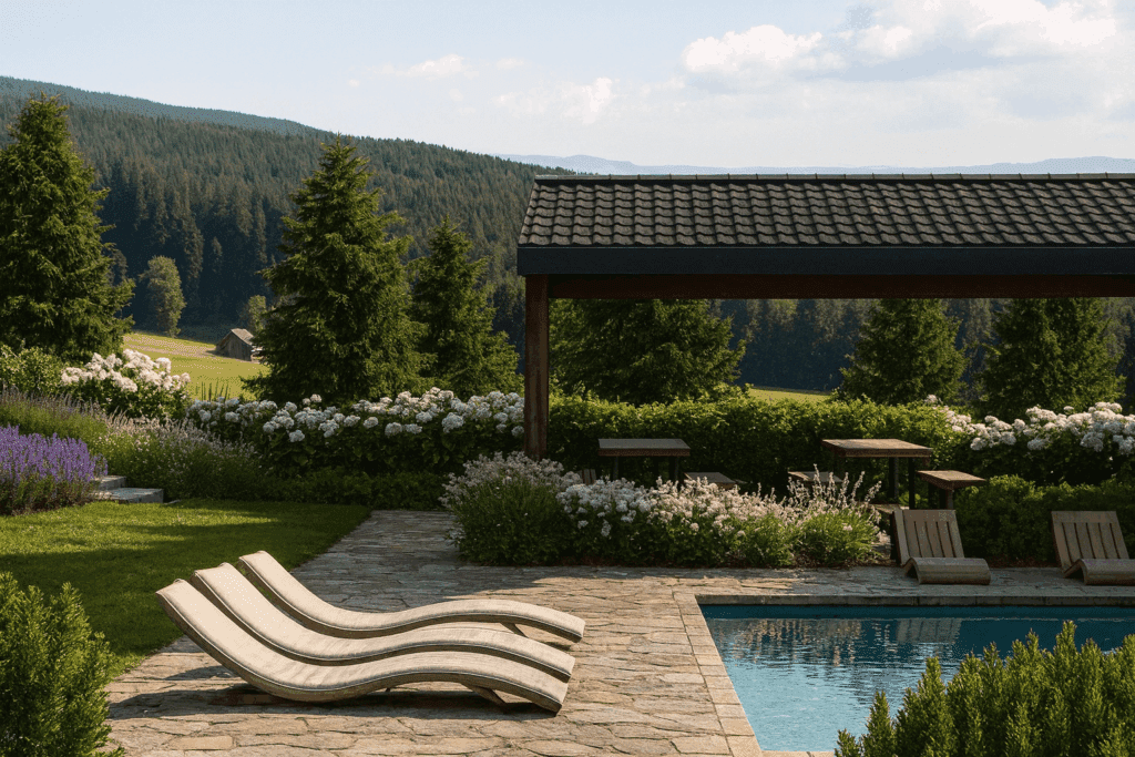 2000 m2 ogrodu, panoramiczny widok na Góry Bystrzyckie, Strefa Jogi i Medytacji, studnia głębinowa z pijalnią wody źródlanej, zewnętrzne saunarium i jacuzzi oraz basen naturalny wykorzystywany przez pasjonatów zimnych kąpieli do morsowania.